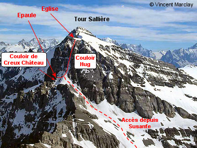 | Itinéraire | Depuis le fond du vallon, passer devant un débouché de tunnel, et prendre un sentier qui monte vers le barrage de Salanfe. On rejoint la piste 4x4 que l’on suit jusqu’au barrage de Salanfe (1925 m). Contourner le lac par sa rive nord jusqu’à rejoindre son extrémité au lieu dit « Creux Château ». Plein ouest, passer un faux plat puis monter des pentes de plus en plus soutenues pour rejoindre le pied du couloir de Creux Château vers 2360 m. Le gravir intégralement jusqu’à rejoindre une épaule (vers 2780 m) sur l’arête nord de l’Eglise. Traverser à l’horizontale flanc nord sur une cinquantaine de mètre dans une pente dégagée mais au-dessus de barres invisibles du haut (gaffe aux plaques dans cette traversée) jusqu’à enfin découvrir le débouché du couloir Hug. Le gravir intégralement, étroit au début mais s’élargissant, 45° puis rapidement 50° soutenu et enfin entre 50 et 55° sur une trentaine de mètres étroits et parsemés de rochers pour sortir sur l’arête vers 3040 m (au centre ou sur la droite suivant les corniches). On rejoint facilement le sommet de l’Eglise en quelques minutes (3077 m). Descente par le même itinéraire. Si l’on désire faire le couloir Hug sans passer par Creux Château il est possible d’y accéder par le vallon de Susanfe que l’on atteint soit depuis le col du même nom lorsque l’on vient de Van d’En Haut, soit depuis le Pas d’Encel en montant depuis Grand Paradis et l’alpage de Bonavau (seulement tard en saison car le Pas d’Encel ne passe pas en hiver). Depuis la cabane de Susanfe (2102 m) emprunter des pentes qui de la droite vers la gauche et en se rétrécissant permettent d’atteindre un large replat au pied du couloir Hug. |