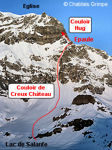 | Pente | 40/45° dans le couloir de Creux Château, 45/50° soutenu dans le couloir Hug avec une sortie >50°. Pente moyenne du Hug: 47°/260m, pente moyenne Creux Château: 42°/430m | Altitude départ | 1370 m | ||||